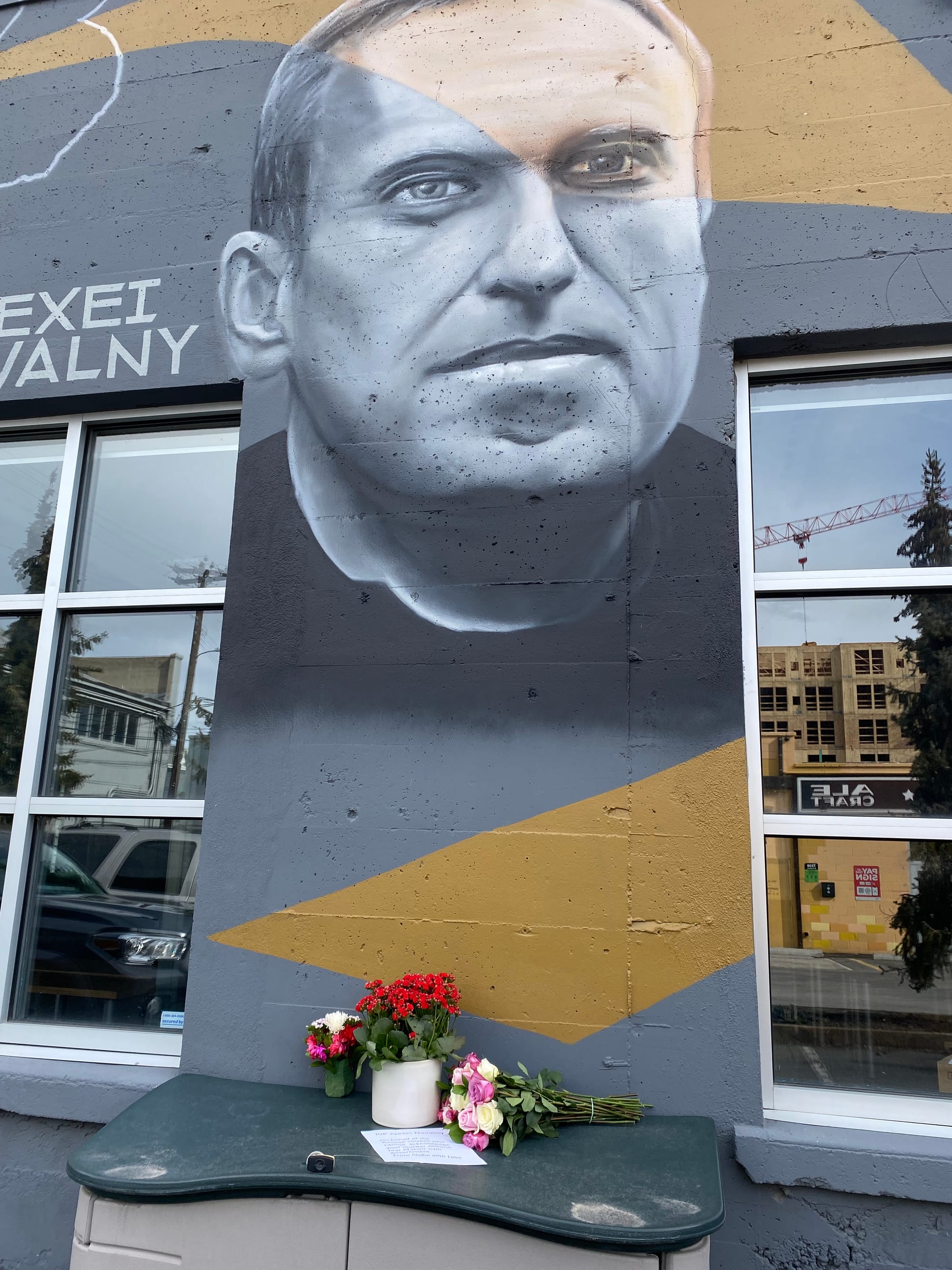 This past week, the large mural with his likeness has become a makeshift memorial with flowers and messages of support for Navalny, his memory, and for human rights. In a small way, it’s helped people in our community deal with this tragic loss – and, I hope, sent its own micro-burst of positive vibrations into the universe in support of the Universal Declaration of Human Rights.