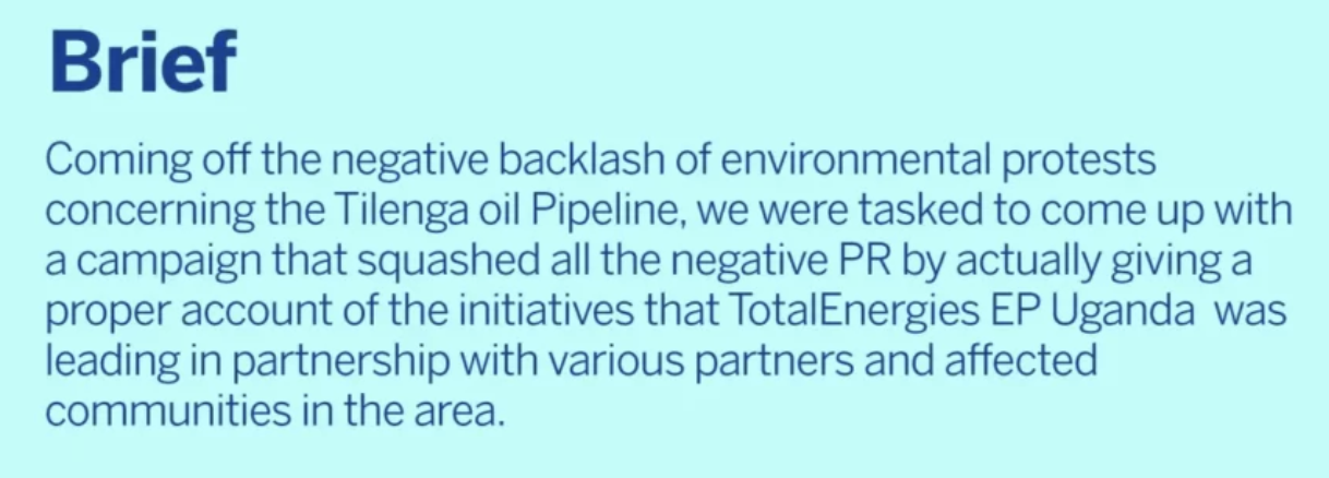 This occurred in Uganda, where the MetropolitanRepublic PR agency, of which WPP is part owner, created a campaign called #ActionForSustainability. It did this for TotalEnergies, a French oil company, with the objective to quash negative PR and protests against the East Africa Crude Oil Pipeline project.