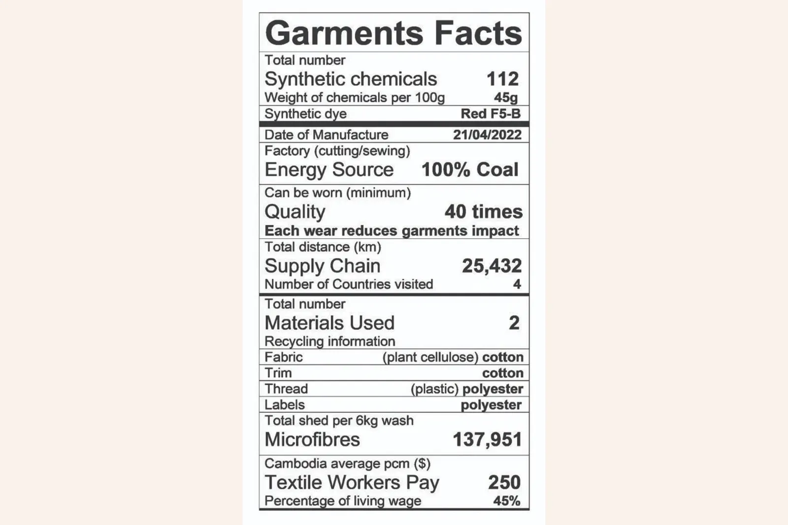 Looking at Gorse’s sample label (below), you get a pretty good idea of how it might influence purchasing habits. For me, two line-items jumped out: Energy Source (100% Coal) and Textile Worker’s Pay (45% of living wages).