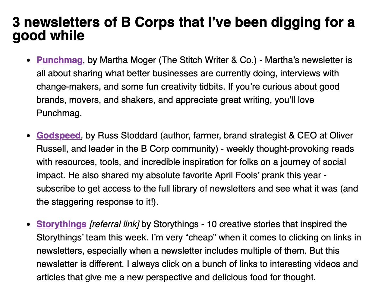 • And a shout-out for Godspeed – Yuval Ackerman of Ethical Emails is one of the sharpest strategists on email around, so it was gratifying when she gave Godspeed a shout-out as one of three B Corp newsletters she's currently digging. She writes a pretty rad newsletter herself. Check it out. (Ethical Emails)