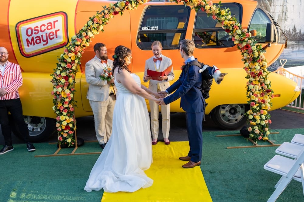 Probably in front of the Little White Chapel in Las Vegas. We hosted nine weddings there, complete with vows filled with hot dog–themed puns like “meat-trimony” and “forever linked.” There was a weenie whistle quartet, a wedding cake made entirely of hot dogs, and we dressed up in full hot dog wedding attire. It was covered by USA Today and People. Equal parts touching, bizarre, and magical.