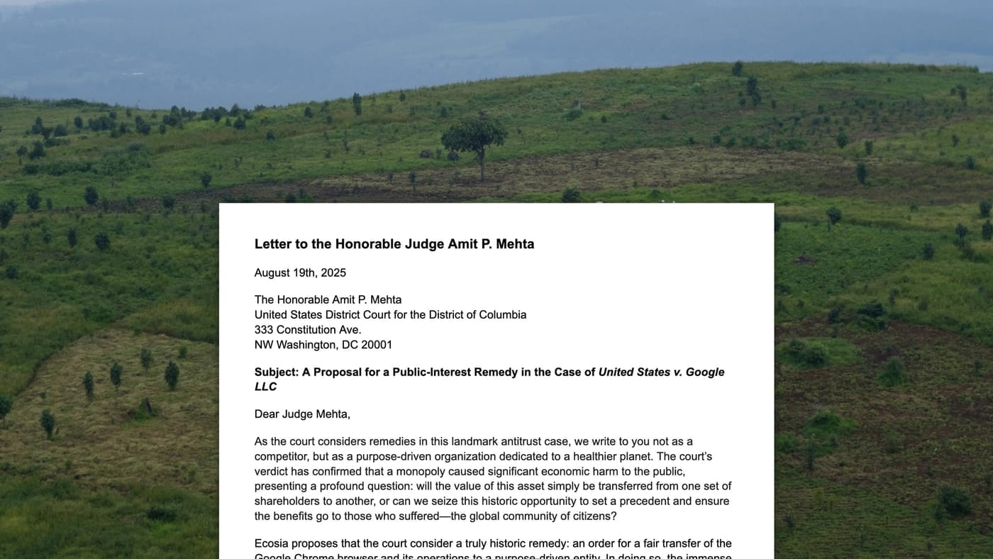 Ecosia’s pitch was to turn over custodianship of the Chrome browser to Ecosia for a term of 10 years, during which it would funnel a majority of profits from its operation into climate solutions. After ten years, it would be transferred to another purpose-driven organization.