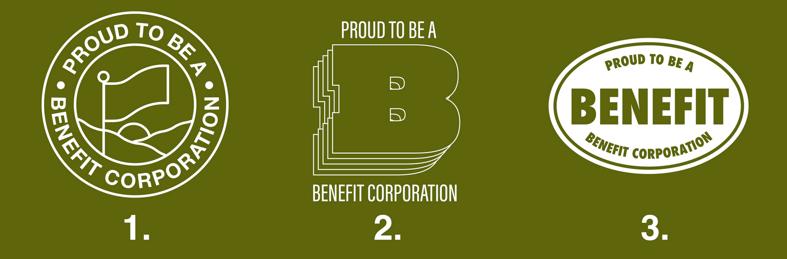 • Public Benefit Corporations have no unifying body, fragmented across legislation in 40 separate states. So, unlike the Circle B of the certified B Corp community, PBC's have no designated and unifying graphic identity. Last year, we played around with three potential logos - which do you like best? (Another good reason to use the comment button at the end of the newsletter 🙌.) If you're feeling artistic, please submit another candidate as we've got some ideas for how this could benefit the benefit corporation movement.