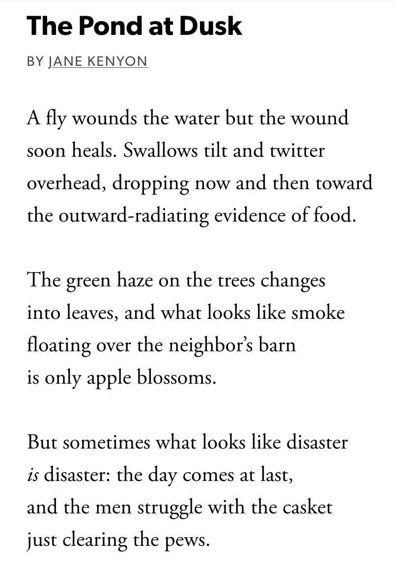 It's time for a poem, people, because whether you're Kipling or AI, the power of poetry is unquestioned. Check out what Jane Kenyon accomplishes in just 72 words.