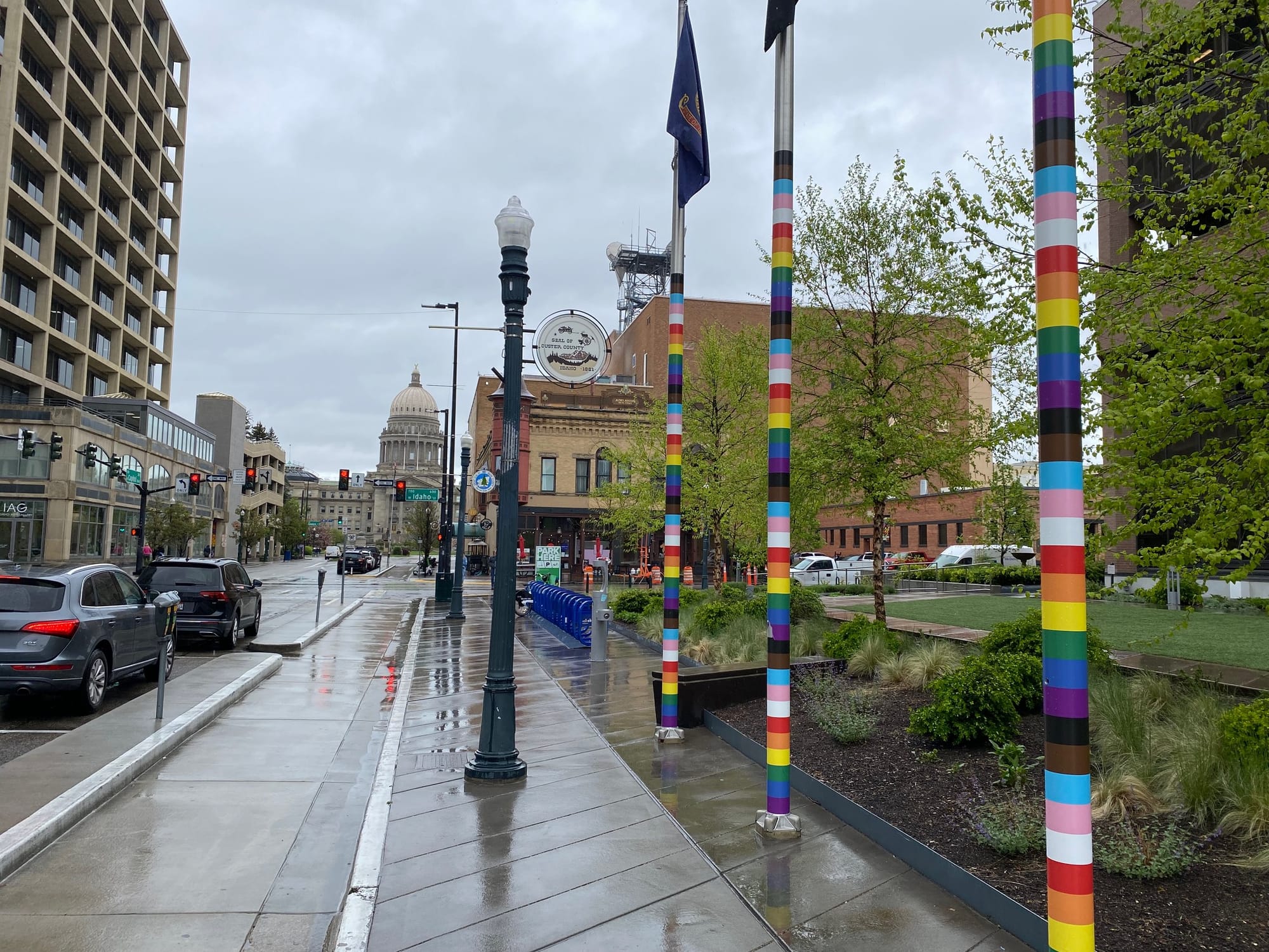 The City of Boise complied with the law the day it was enacted. The Pride flag came down, and a week later the rainbow colors went up again – this time ringing the flagpoles, which are now rainbow adorned and fully in compliance with state law.