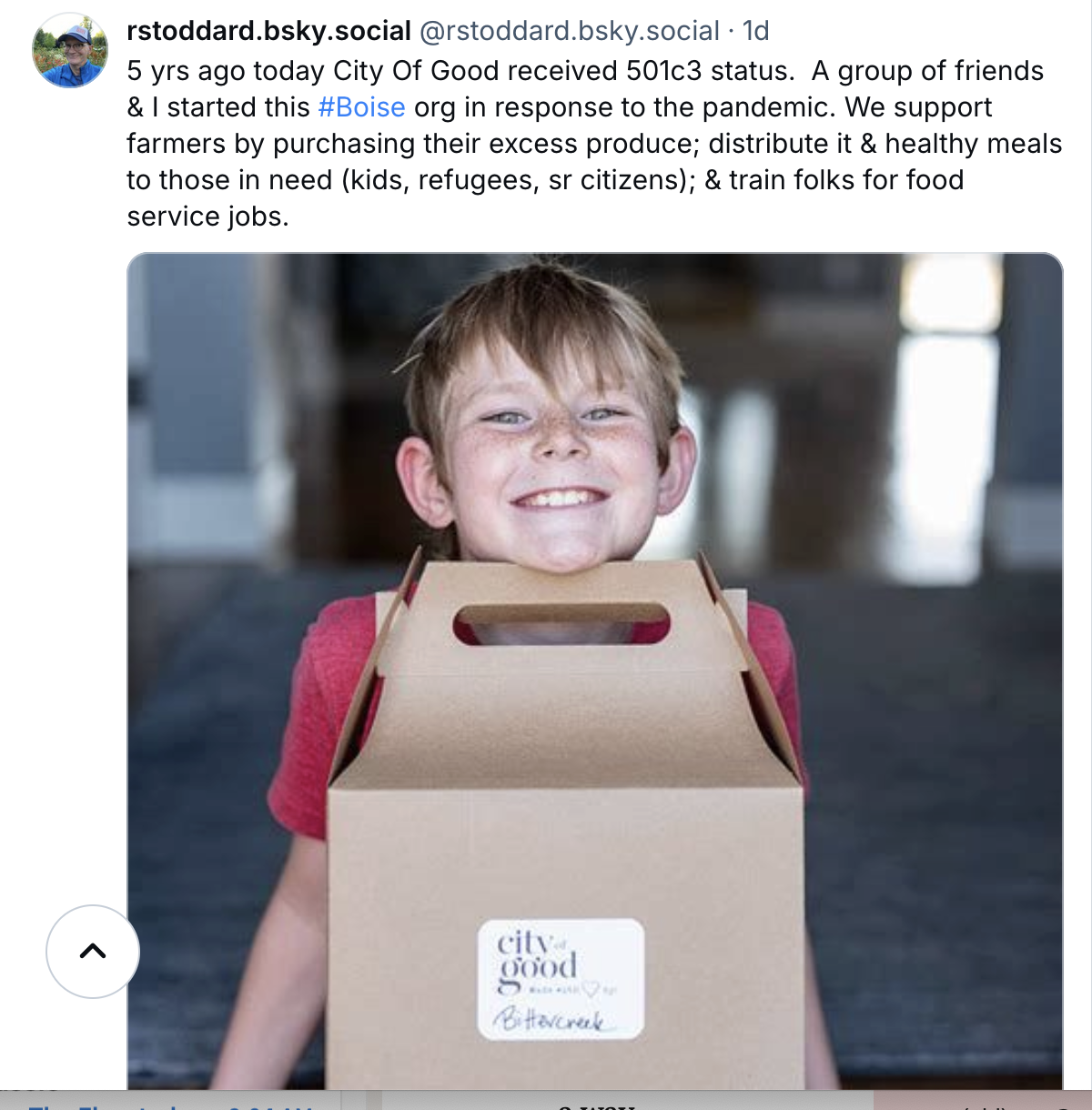 I serve on the board of City of Good, a nonprofit that supports local farms and food producers and distributes healthy, nutritious meals, local produce, and shelf stable goods to vulnerable communities in Boise. This year I had the honor of volunteering 31 hours with this fab group.