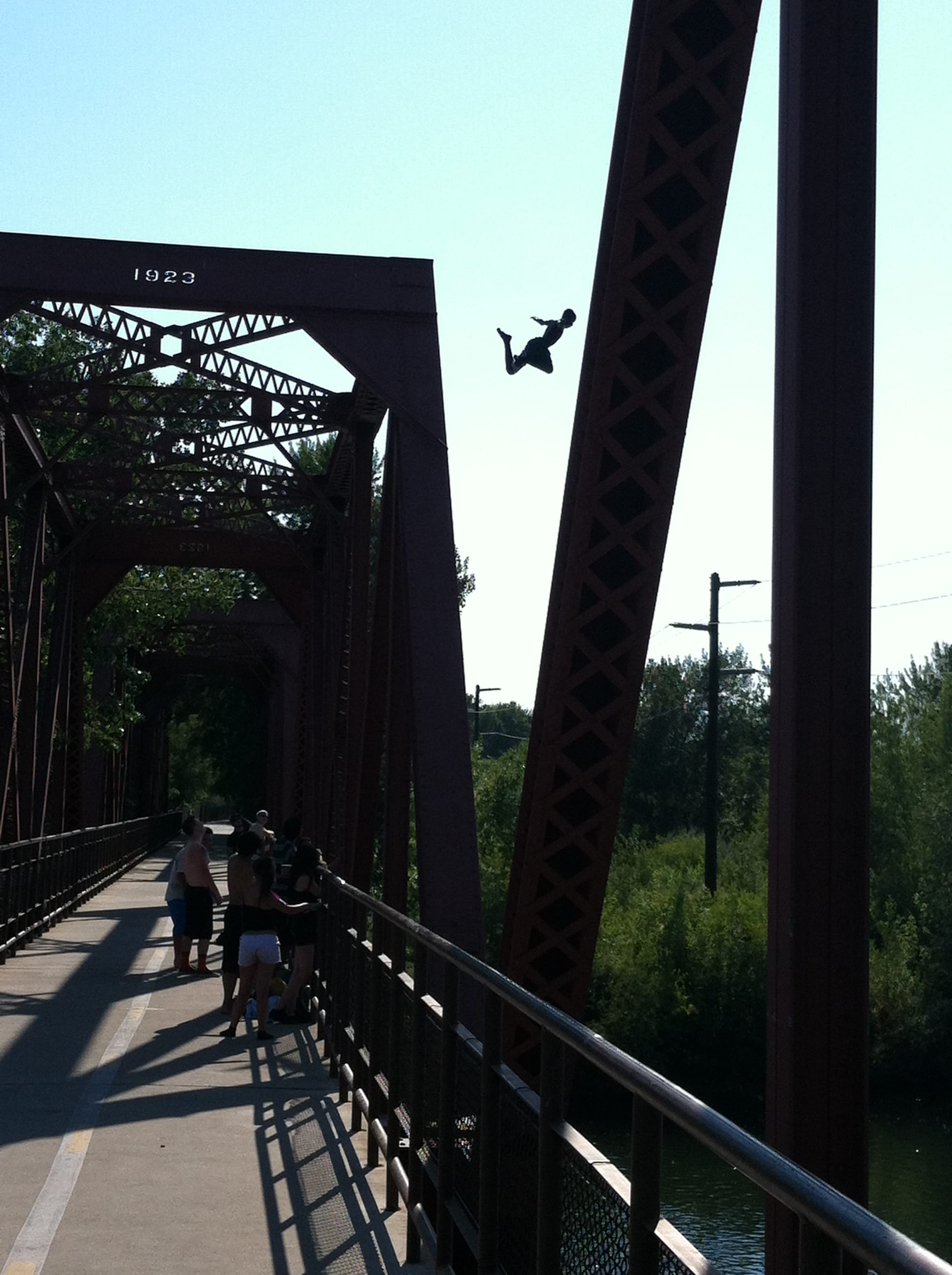 And I was fortunate enough to capture the moment with my iPhone as he was suspended amid the sky and the steel trusses of a suspension bridge.