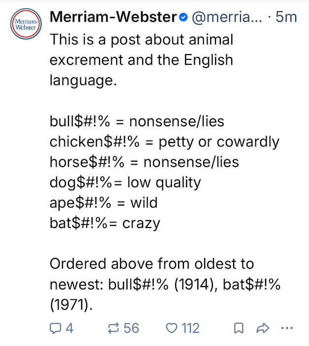 Where were the clever minds at Merriam-Webster when I was young and looking f guidance from the dictionary? Cut the Bull$#!% – a handy guide to animal excrement's vital spot in the English language.