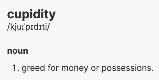 - When Cupid doesn't equal Cupidity – Cupidity. A new word to me and perhaps for you? It means "greed for money or possessions." Interesting that it rhymes with stupidity. Seems right for the times.