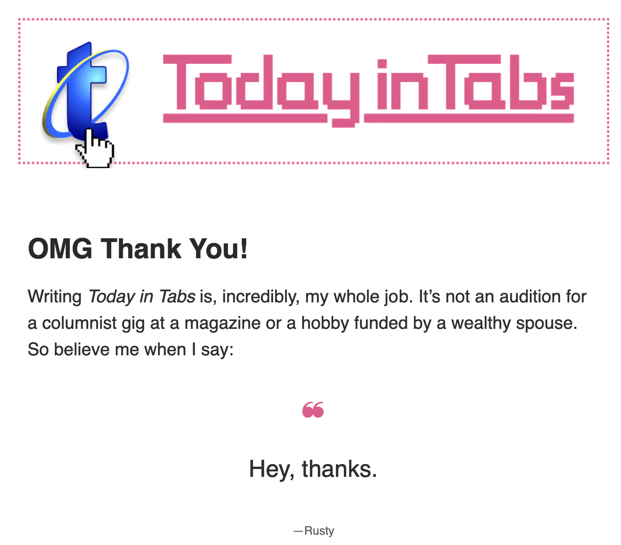 Perhaps I’m chasing a ghost or, more specifically, chasing Rusty Foster who publishes Today in Tabs. I first learned about Rusty and his e-newsletter in a New York Times feature story (with photos by Greta Rybus, a highly regarded photojournalist who – true fact – I once coached as a second-grader on a soccer team here in Boise a long time ago). Rusty’s newsletter is financially successful, at least from my perspective – it allows him to write as his only job – and his voice is one of the more original I’ve encountered. It’s a fun read for its quirk and its quiver. And yes, I’m a paid subscriber.