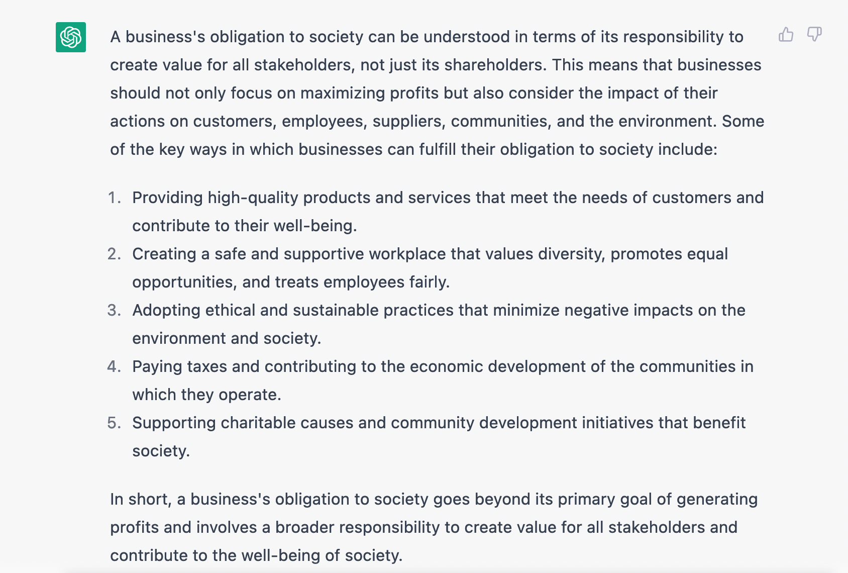 I had my own play date with ChatGPT and asked it all sorts of questions about ESG, woke capitalism, and the like. At its root, I wanted to see how it felt – whoops, AI doesn’t have emotions, does it? 😱 – I wanted to see how ChatGPT would define the obligation of a business to society. Check out its response in the graphic below.