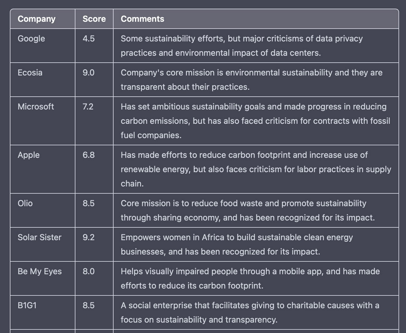 He then added several other purpose-driven companies to the mix. You can see in the graphic table below what ChatGPT spit back to him in a blink.