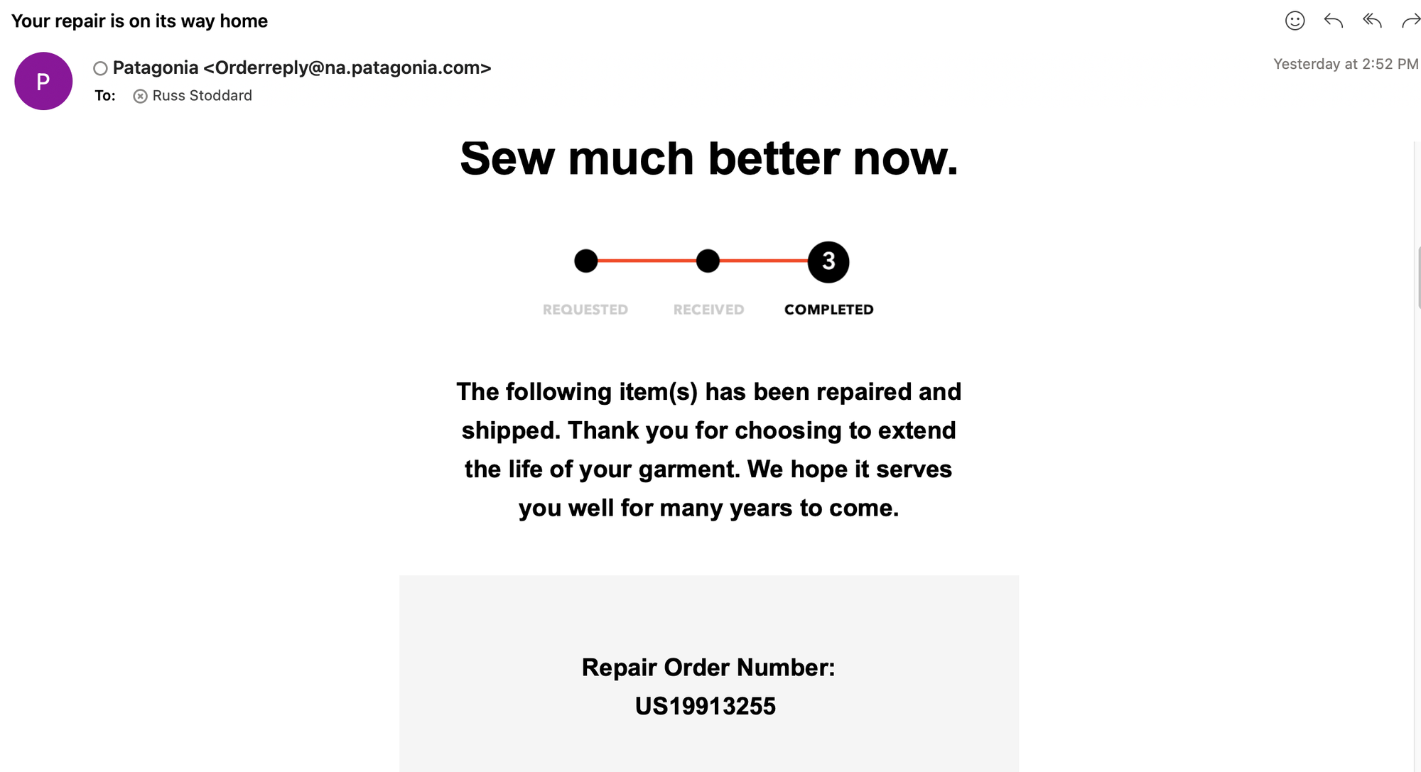 Beyond the functional experience, I was impressed with how Patagonia uses the opportunity to cleverly reinforce its brand messaging at numerous touch points. When I received an email letting me know they'd received the jacket, it said, "Your repair has entered the fray." The next email let me know my repair had been completed and would arrive shortly (Sew Much Better Now!). And when I opened the package with my repaired jacket, there was a thank you card - for me, for taking the positive environmental step of repairing the jacket. They made me feel like the sustainability champion!